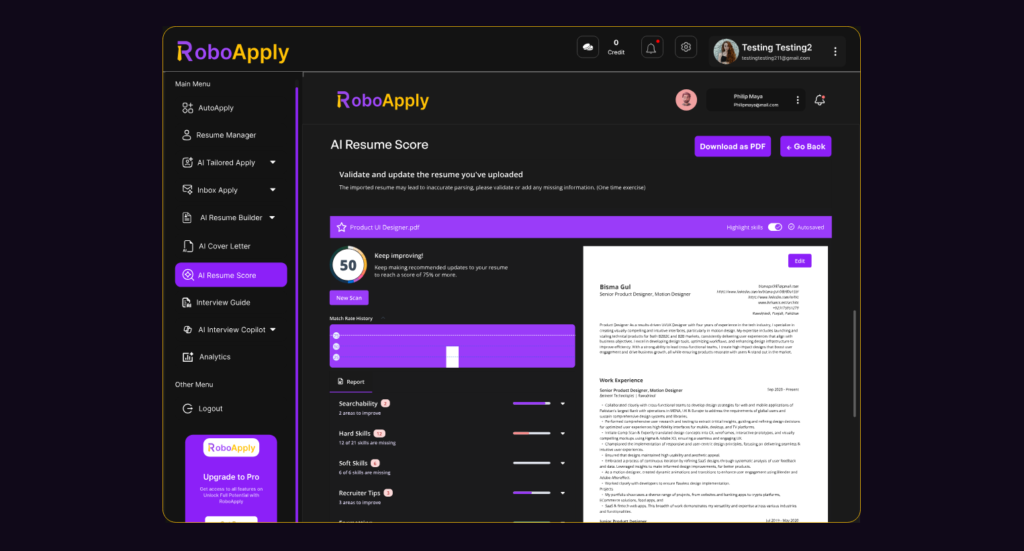 For active searches involving dozens of applications, AI Auto Apply submits customized versions across platforms automatically. The AI Cover Letter generator creates matching letters for each position. You can also use Resume Score to check your document before submission.